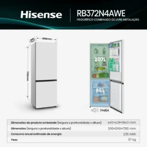 Frigorífico Combi HISENSE RB372N4AWE (No Frost – 178.5 cm – 292 L – Blanco) El Hisense RB372N4AWE es un frigorífico combi de diseño elegante en blanco clásico, con una altura de 178,5 cm y una capacidad total de 292 litros, ideal para familias pequeñas y medianas que buscan un electrodoméstico eficiente, silencioso y con funciones…