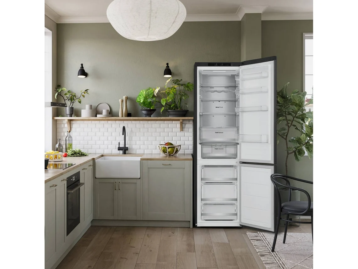 El LG GBVE2801EV A-25% es un frigorífico combi de alta gama diseñado para quienes buscan máxima eficiencia energética, gran capacidad y un diseño elegante en color negro. Con una altura de 203 cm y un volumen total de 384 litros, combina a la perfección espacio, tecnología No Frost y un consumo ultra reducido de solo 83 kWh/año gracias a su clasificación energética A.
