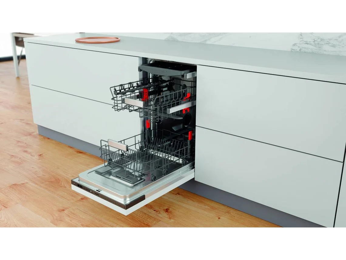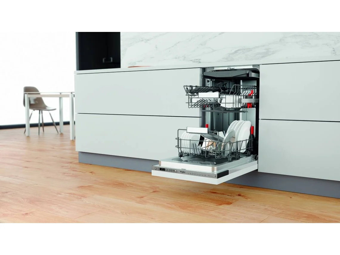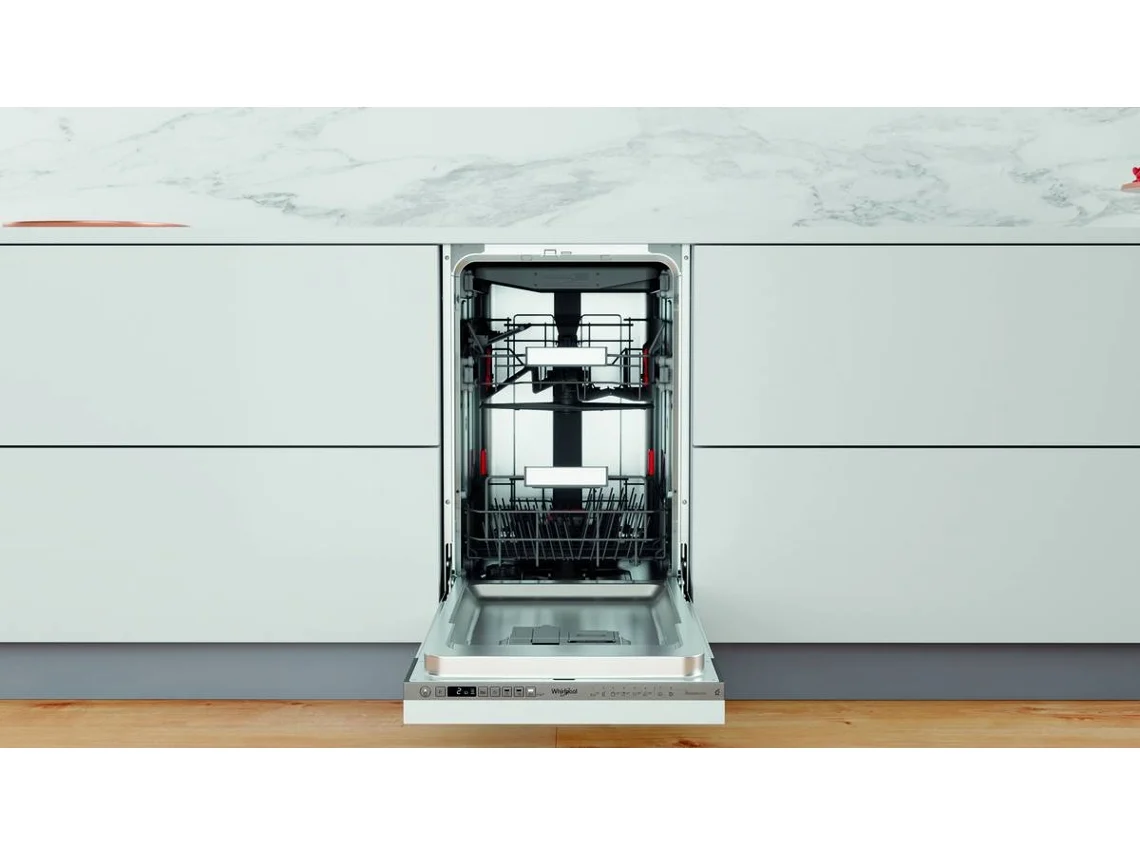 El lavavajillas empotrable WHIRLPOOL WSIO 3O34 PFE X combina diseño elegante, dimensiones compactas y alto rendimiento, convirtiéndose en una opción ideal para cocinas modernas con espacio limitado. Su ancho de 45 cm permite una instalación sencilla sin sacrificar capacidad ni eficiencia, ofreciendo hasta 10 servicios en cada ciclo de lavado.